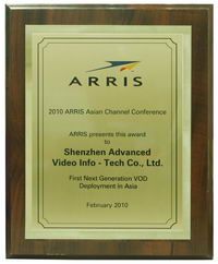 2010年2月份,視頻與寬帶網絡設備供應商ARRIS在其2010年亞太區(qū)經銷商會議上,向佳創(chuàng)視訊頒發(fā)了“First Next Generation VOD Deployment in Asia”(下一代視頻點播系統亞洲第一部署規(guī)模)的獎項。