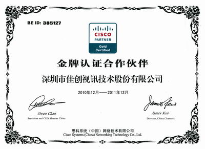 2010年12月,深圳市佳創(chuàng)視訊技術(shù)股份有限公司通過了美國(guó)思科(CISCO)系統(tǒng)有限公司的最高級(jí)別認(rèn)證,正式成為CISCO金牌認(rèn)證合作伙伴。此次順利通過CISCO金牌認(rèn)證,標(biāo)志著佳創(chuàng)視訊在提供數(shù)字電視整體解決方案方面的實(shí)施能力和服務(wù)水平取得新的提升。