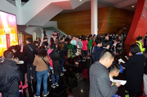 簽到并兌換入場券之后,有序排隊、準(zhǔn)備進場的小朋友和家長們。